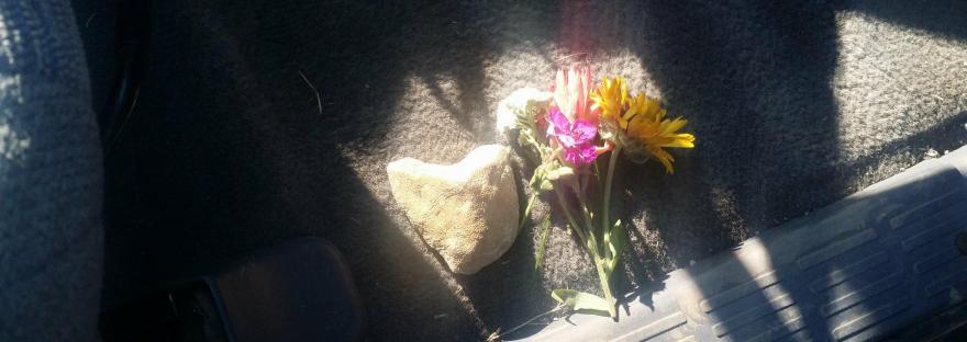 This photo is of a bouquet of flowers that were laying on the trail. The heart stone was found nearby. We left the forest friends some goodies and a large smily face ball I bought for them. My son and nephew were at this same lake last week and a large heart shaped stone was on the trail. My nephew has had communications with the forest folks also. I asked him to take me there. He fished and I just relaxed in a hammock. I loved the fresh air and beauty. Got some meditation done there too. Although I was hoping to, I did not receive mind speak. I am thrilled with the stone and bouquet and hope the forest friends left them there for us.