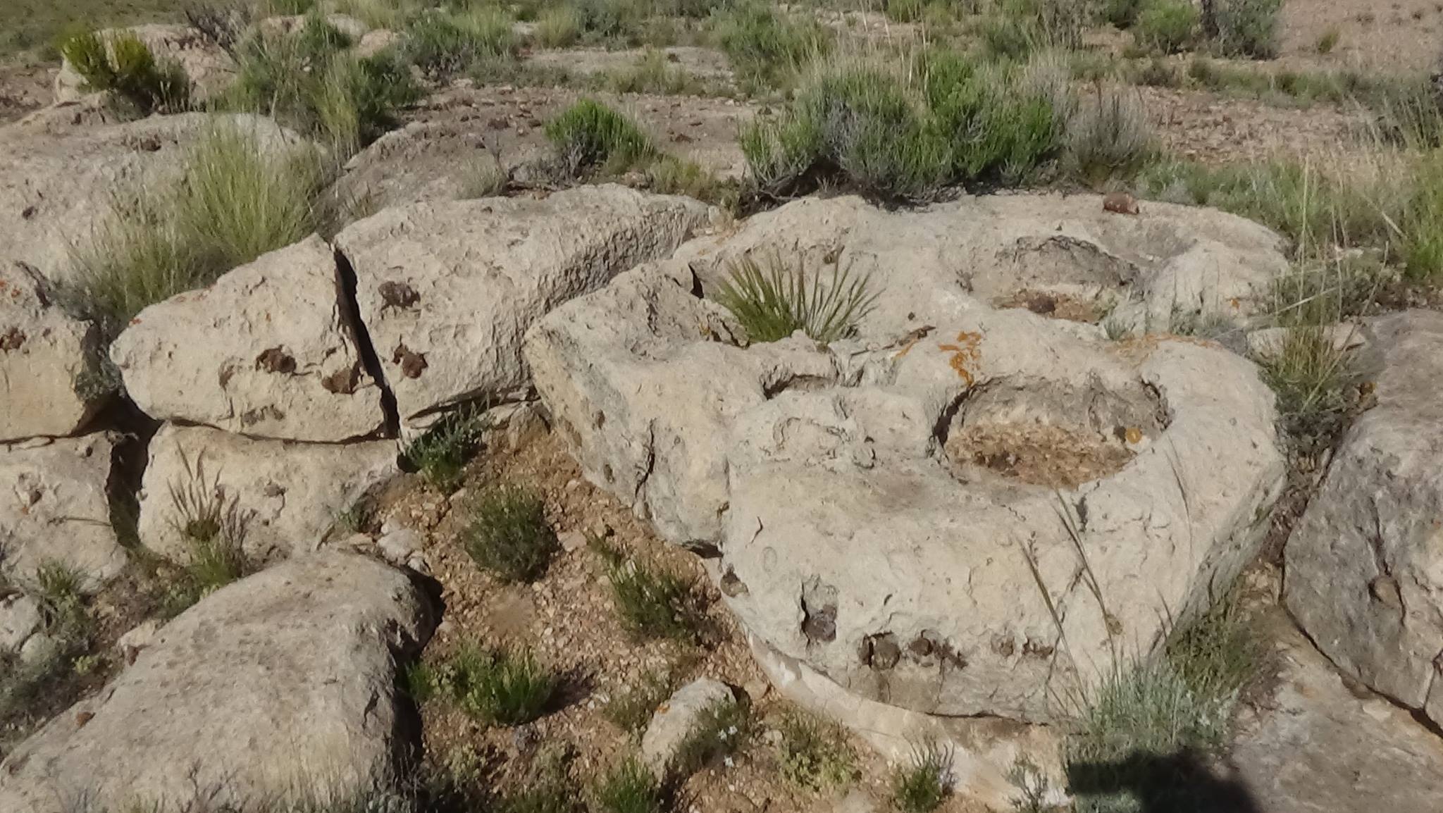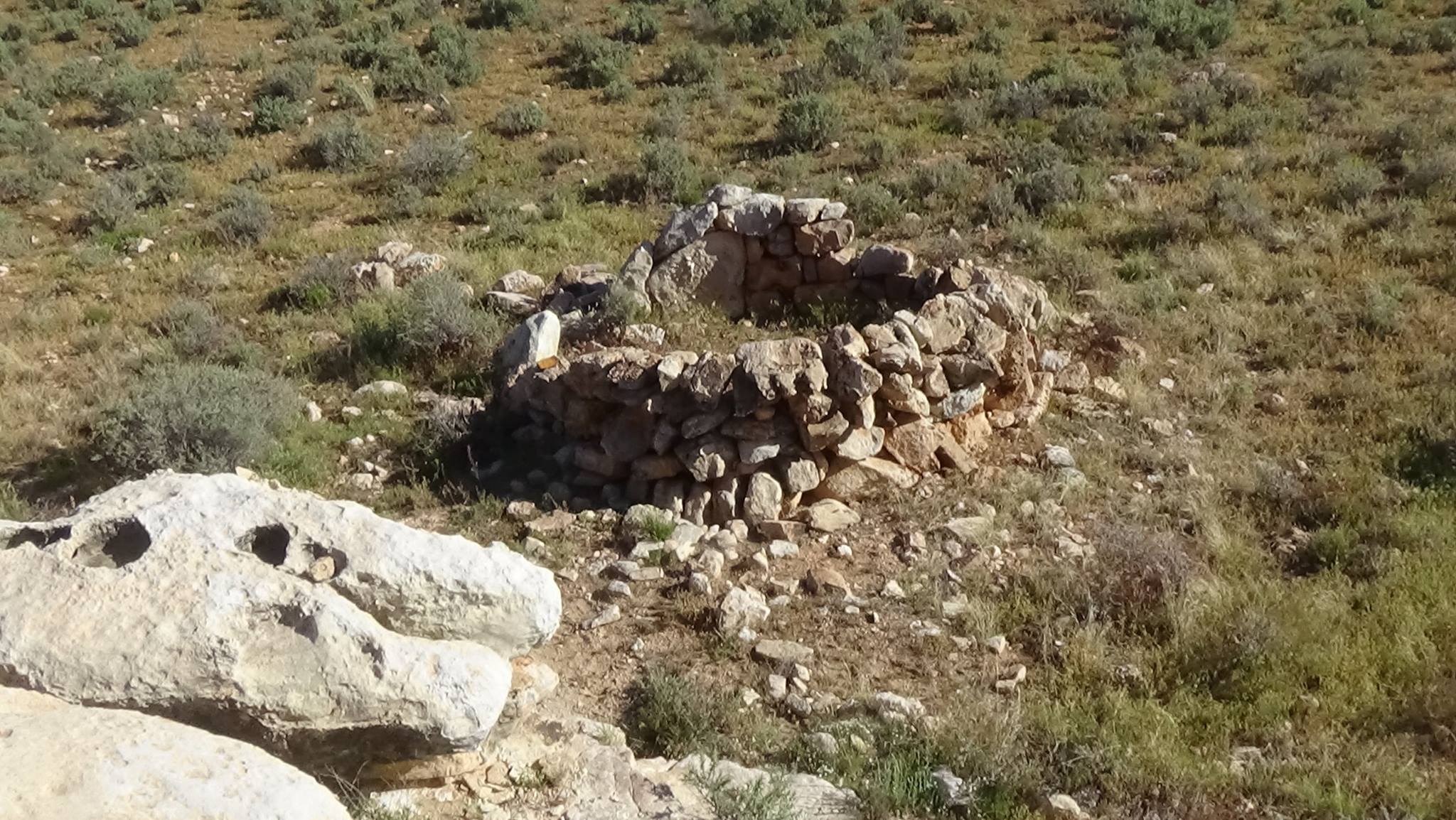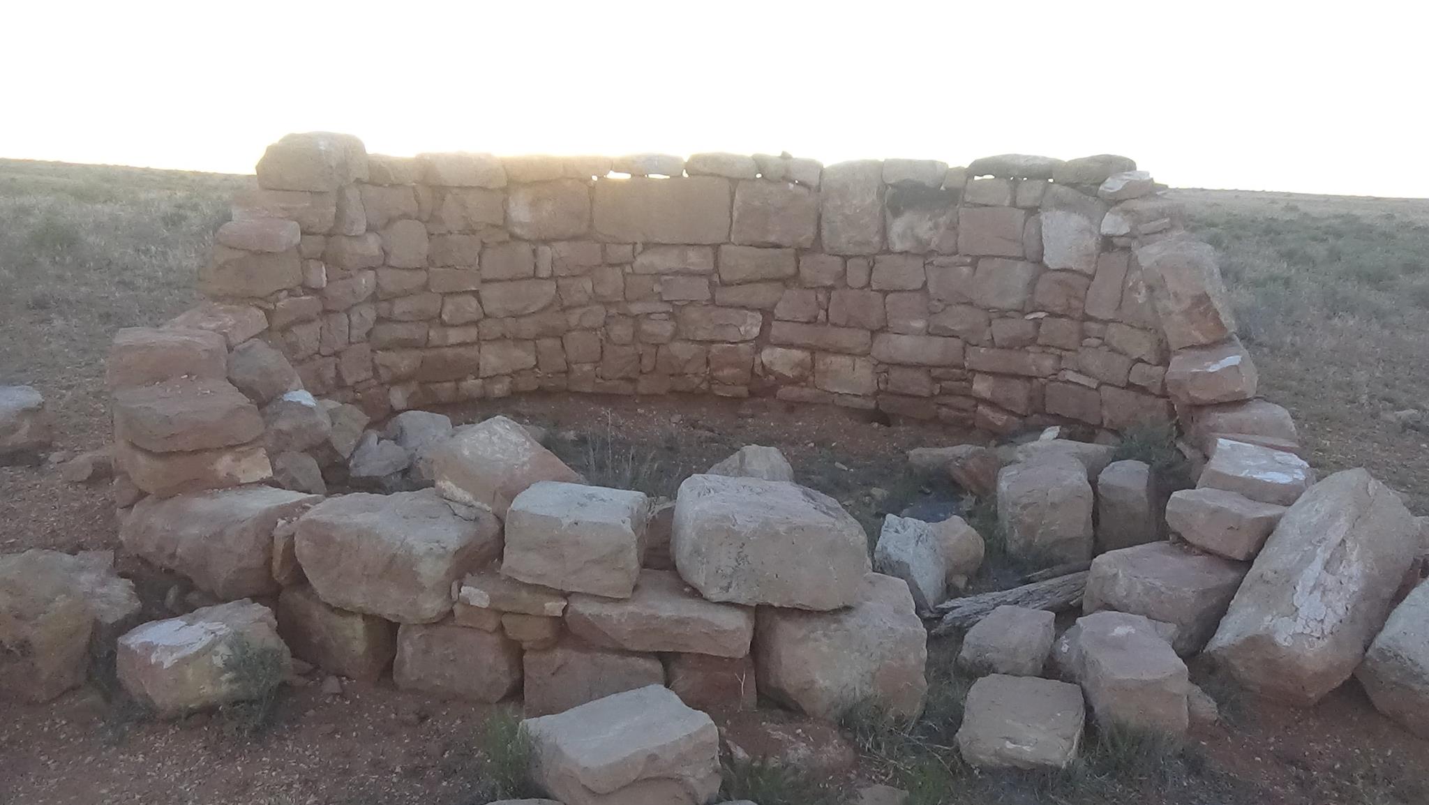 Day 2: On the second morning of my quest, I left my campsite by the empty corral of metal fences and soon found another older corral made of roughly piled up stones of various types arranged in a vaguely circular shape. This is one of the more recent structures built by the Dine (Navajo, as the Spaniards called them), who still live in this region. As a comparison, there is nearby an older ruin of a round structure (see previous album) made of well fit squared blocks of limestone, some of which were removed and reused to built later structures.