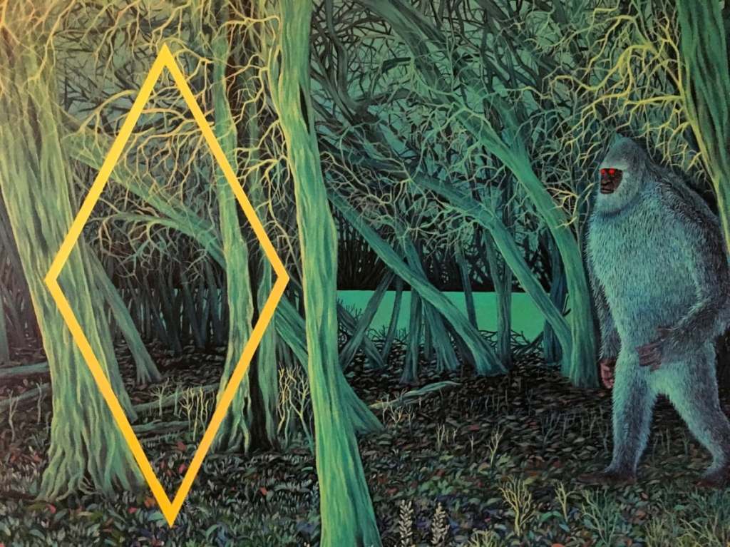 While many Sasquatch believers tend to have their faith in its existence ridiculed, Allen notes that as an artist he gets more freedom to explore the “woo” side of Bigfoot legend. Woo theories of the creature include the idea that it’s part of an enlightened species that maintains a deeper level of connection with the natural environment. But Allen has brought his own origin story into the mix, and that’s what you’ll find in his Supernatural Sasquatch series. Allen’s vision includes diamond-shaped portals in the woods, glowing red eyes, infrasonic sound waves and an admittedly judgmental temperament. In Allen’s most recent painting, the Sasquatch gazes directly at the viewer with a look of sombre disapproval. In his left hand, he holds a massive log that he bangs against a tree to ward off anybody breaching his territory. And he does so with good reason: Allen’s beast sees humans as a wasteful, destructive and ignorant species. He laments, if only they would evolve and realize the importance of living in harmony with the natural world around them.. but until then, the Sasquatch waits, and humans are lucky if we catch a glimpse of its glowing red eyes in the trees before the Bigfoot steps through a portal and disappears.