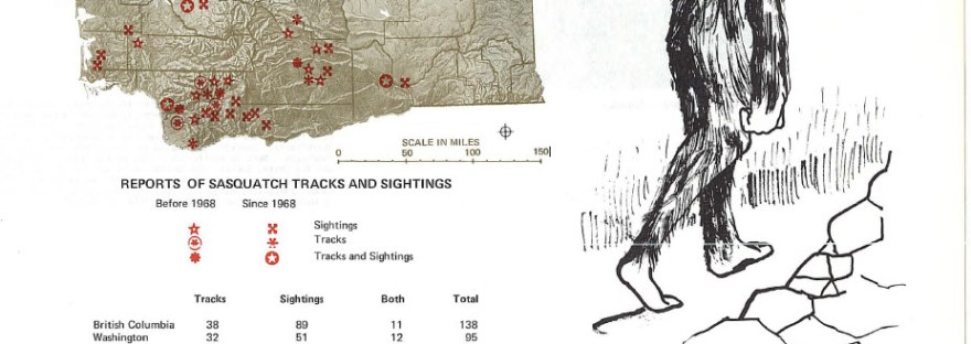 Native flora and fauna were chronicled in great detail. Plants included Pacific Dogwood, Yellow-Eyed Grass and Sitka Spruce. Animals ranged from fish to mammals. Amongst descriptions of bald eagles, elk and trout a particularly unconventional critter stood out: the legendary Sasquatch. A page from the Washington Environmental Atlas provides detailed information about Sasquatch. Multiple illustrations of the elusive beast are depicted along with a geographic chart containing numerous firsthand encounter locations.