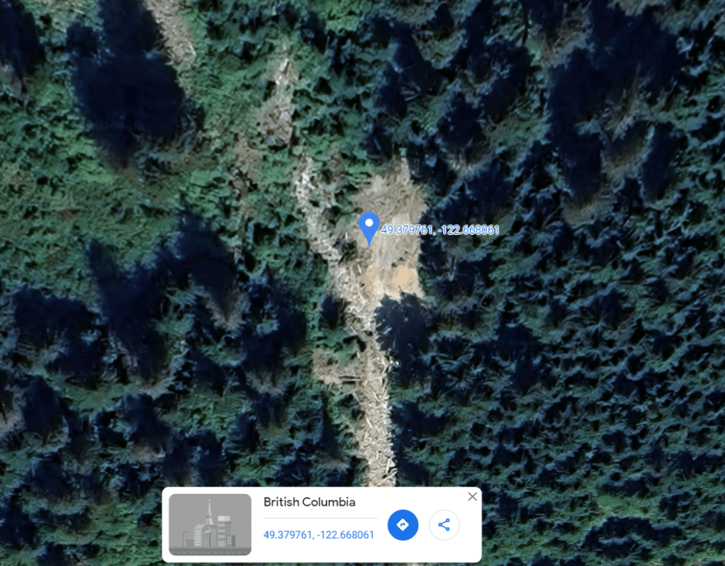If you google satellite image of these co-ordinates, 49.379753,-122.668118, you will find an interesting feature which does look like a large Sasquatch. You can decide for yourself, I haven’t been able to find another photo to compare to see if the anomaly is not there in photos from other dates, so who knows, but I did hear them going off into that direction sometimes so an interesting satellite image.
