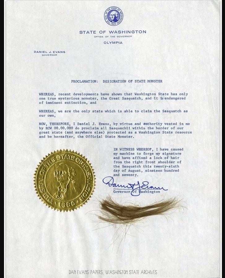 Washington state proclaimed Sasquatch its official state monster: So claims the title of the Interesting Facts article linked here. However, it concludes that ”More recent endeavors, in 2017, attempted to solidify that official status when state Senator Ann Rivers introduced bill SB 5816, calling for Sasquatch to become the state’s official monster. The bill was referred to committee but has yet to be signed into law, which means that for now, the Sasquatch’s official status — much like the creature itself — remains elusive.”